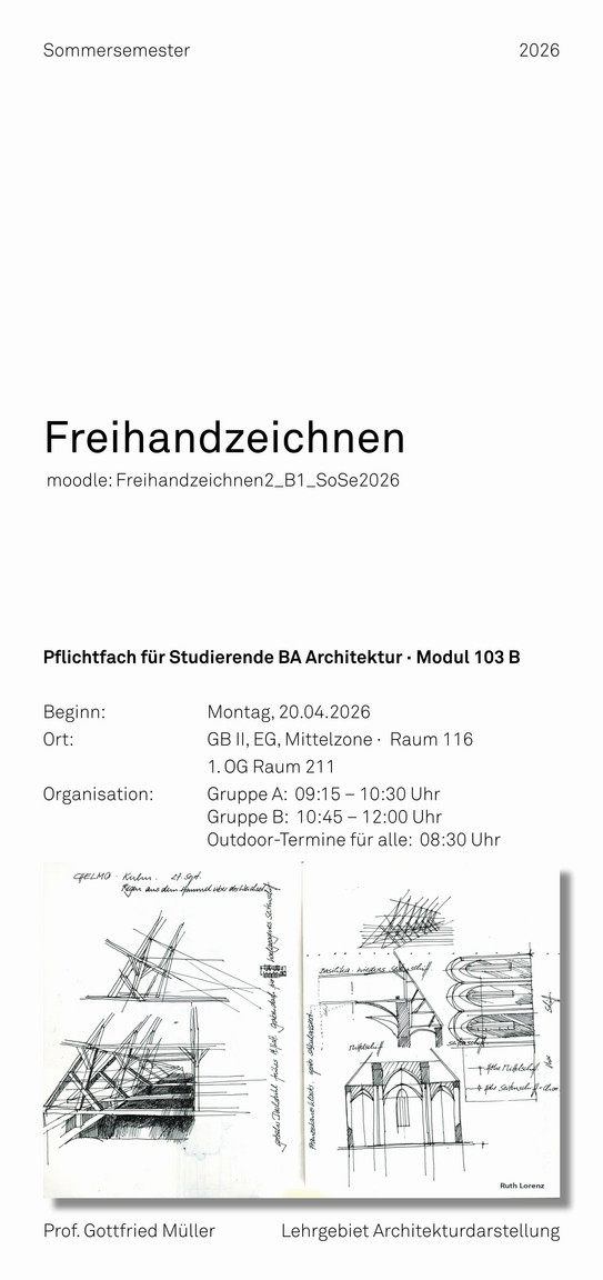 Anhand von 6 Halbstages-Exkursionen innerhalb von Dortmund soll die gebaute Umwelt analysiert werden. Hierbei werden nicht nur die Stilmerkmale von Gebäuden untersucht, sondern alle Aspekte der Architektur: Vom städtebaulichen Kontext über historische und soziologische Faktoren bis zu konstruktiven Aspekten soll Architektur als vielschichtiges Phänomen befragt und begriffen werden. Hierbei spielt auch die Verschriftlichung eine Rolle, sodass die Verbindung von Freihandskizzen und Text als Werkzeug der Informationssammlung und -verarbeitung Verwendung findet. Ziel ist es, durch die Erfassung mit dem Bleistift das Denken und die Kommunikation über Architektur anzuregen. Die Exkursionen werden von vorbereitenden Übungen begleitet.