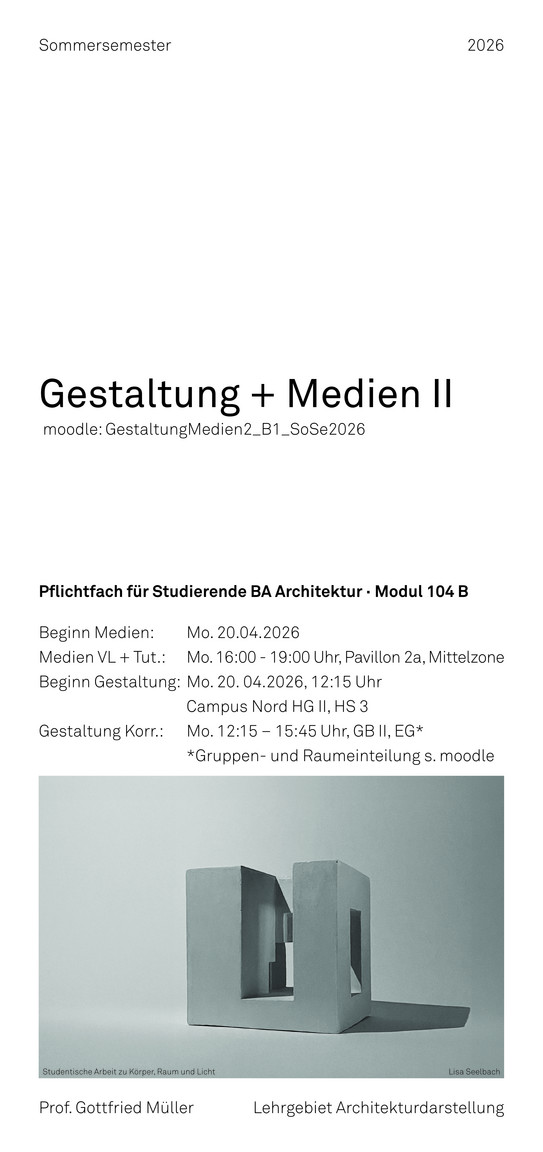 Im Teilfach »Digitale Medien II« des Moduls »Gestaltung und Medien II« für Architekturstudierende (Sommersemester) werden die vier Themengebiete »2D«, »3D«, »Bildbearbeitung« und »Layout« aus »Digitale Medien I« vertieft und erweitert. Die 2D-Übung des Vorsemesters wird von der Genehmigungsplanung in die Ausführungsplanung überführt. Eine Perspektive aus dem Block »3D I« erfährt in Bildbearbeitung II eine Aufbereitung mit räumlichen Texturen und Staffage. »Layout II« behandelt Plangrafiken und Portfolio-Layouts und in »3D II« setzen die Studierenden ihre in »2D II« erarbeiteten konstruktiven Details in kurzen animierten 3D-Schnitten um.